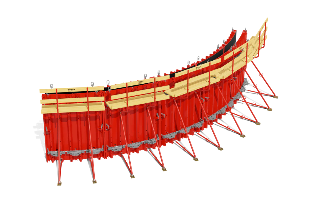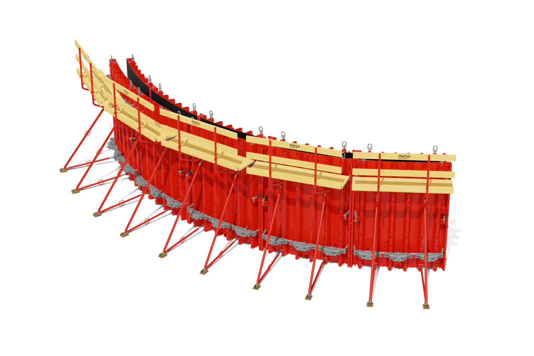 La superficie del encofrado está hecha de una plancha de acero de 4mm de alta resistencia, esto le binda al encofrado una gran resistencia a la fatiga del metal. Se obtienen excelente superficies del concreto sin necesidad de trabajos adicionales de terminaciones. Los ajustes de radio se realizan en forma rápida y simple en obra. A pesar de la simplicidad de ajuste de radios, para disminuir los tiempos de instalación los paneles pueden ser despachados preajustados al diámetro deseado.