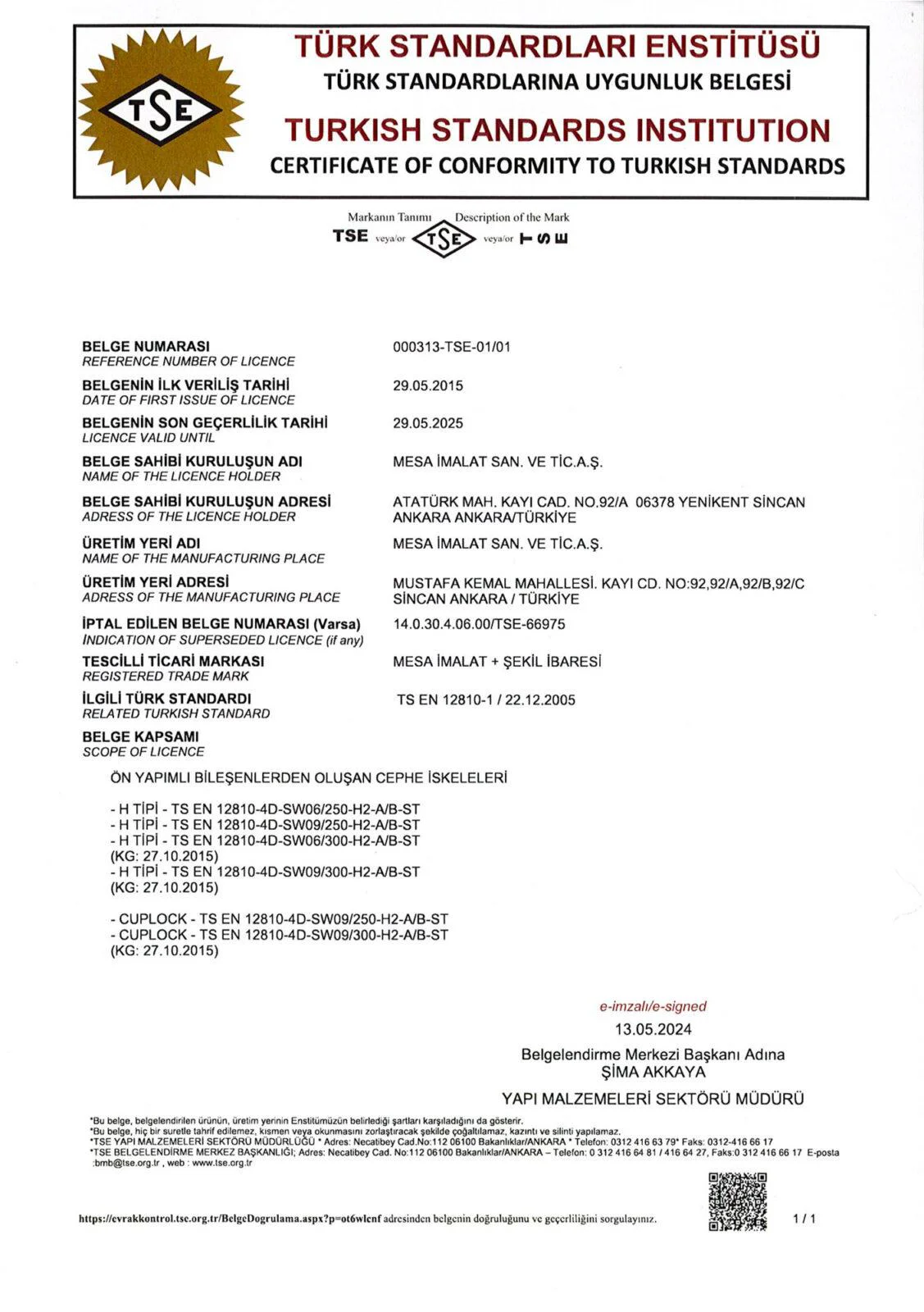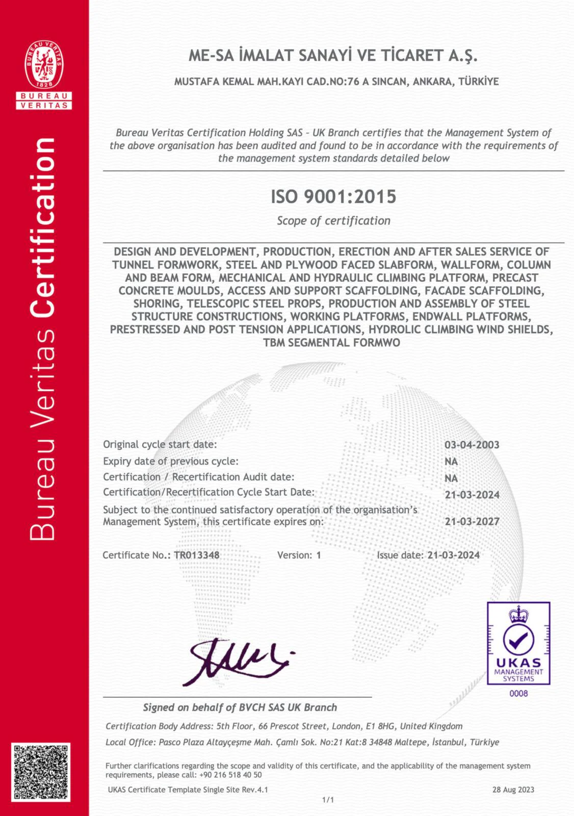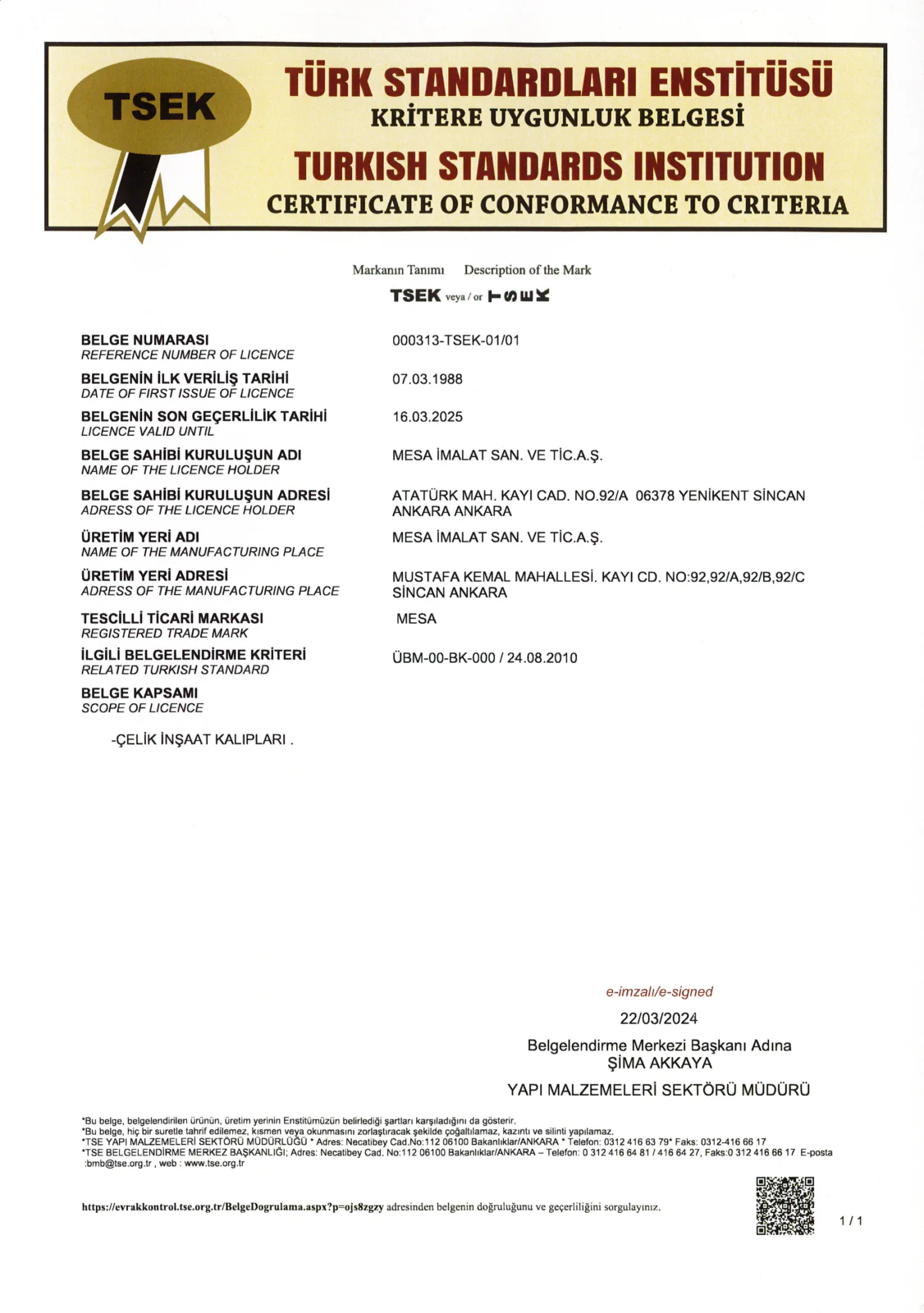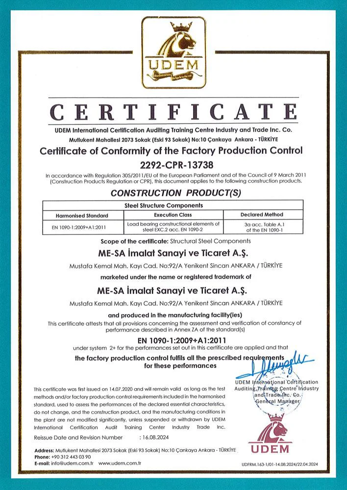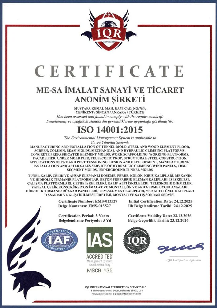 На предприятиях MESA İMALAT, под гарантией Системы Качества ISO 9001 и контролем общества «Bureau Veritas» осуществляется производство высококачественной продукции.