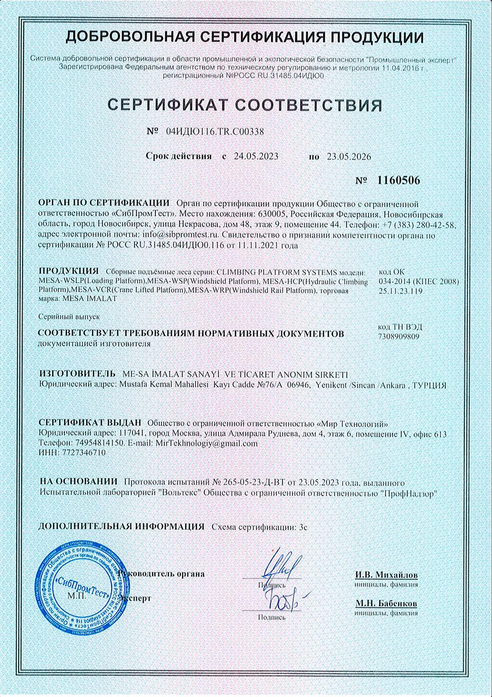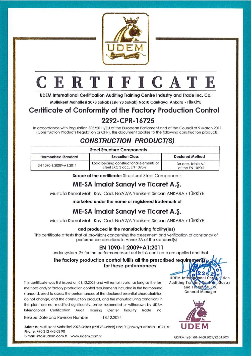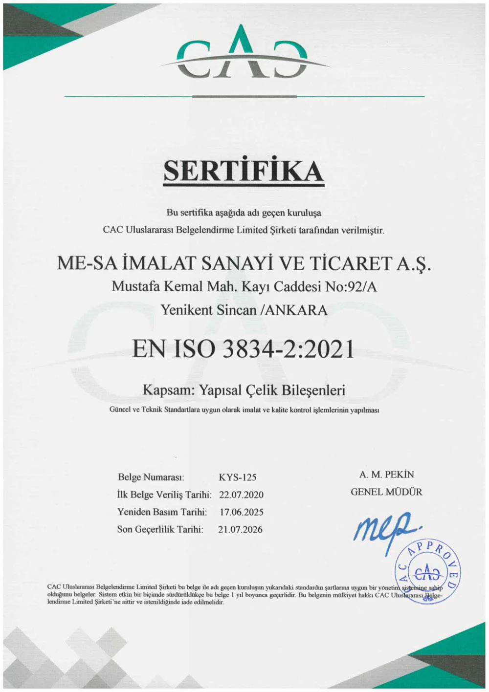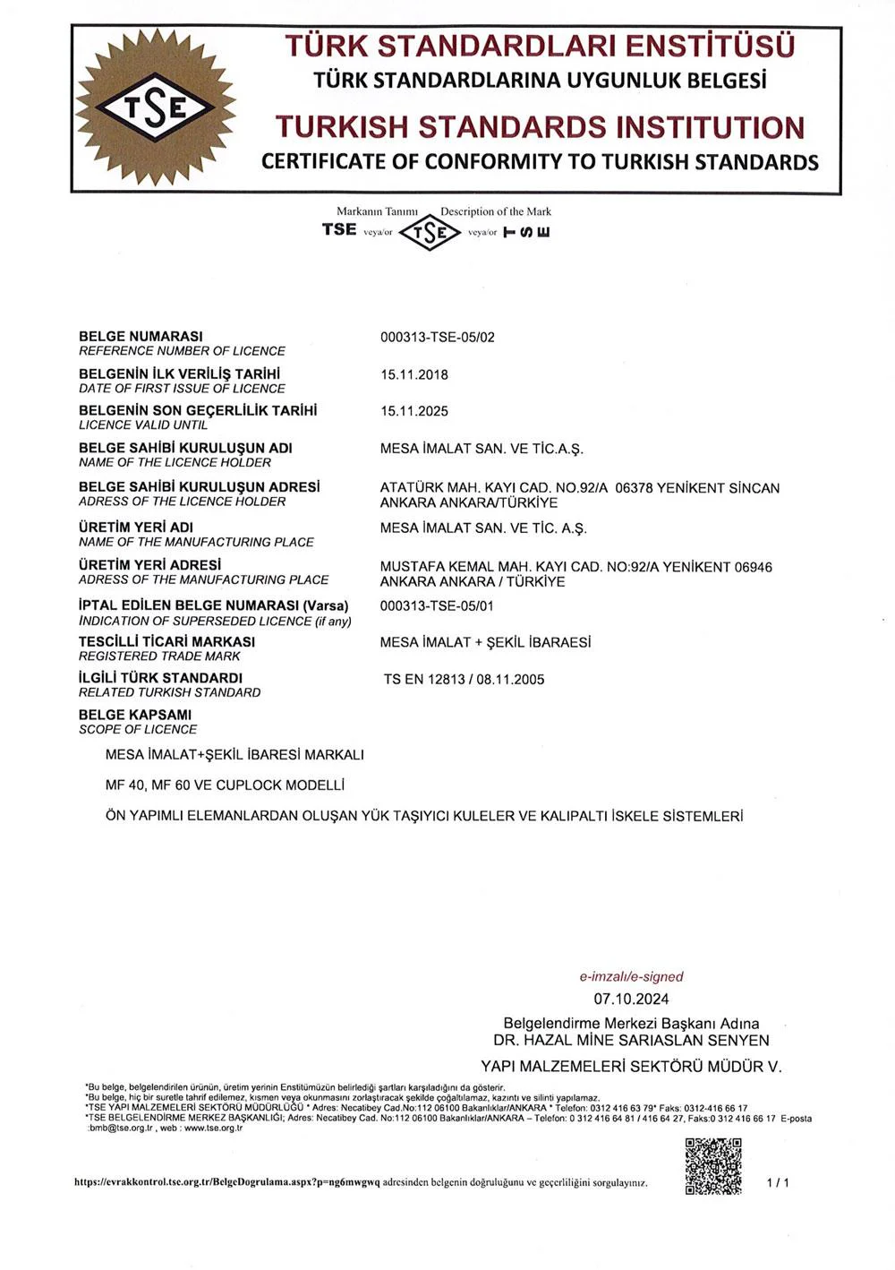 На предприятиях MESA İMALAT, под гарантией Системы Качества ISO 9001 и контролем общества «Bureau Veritas» осуществляется производство высококачественной продукции.