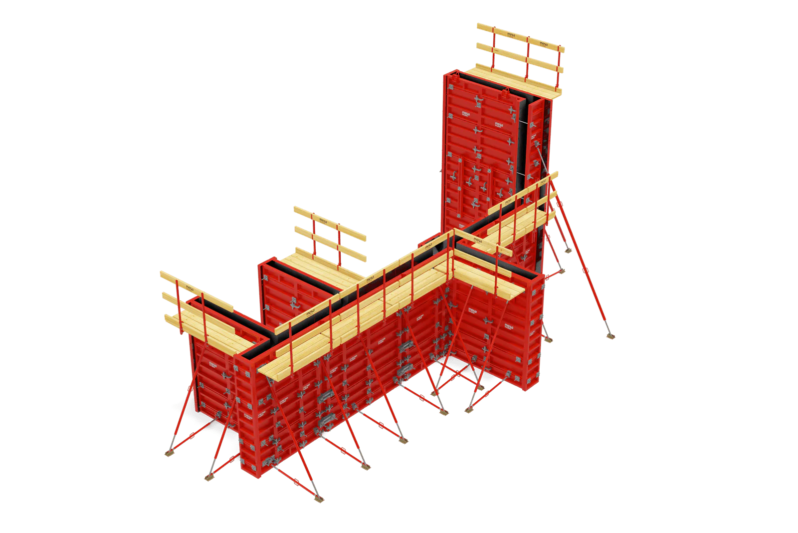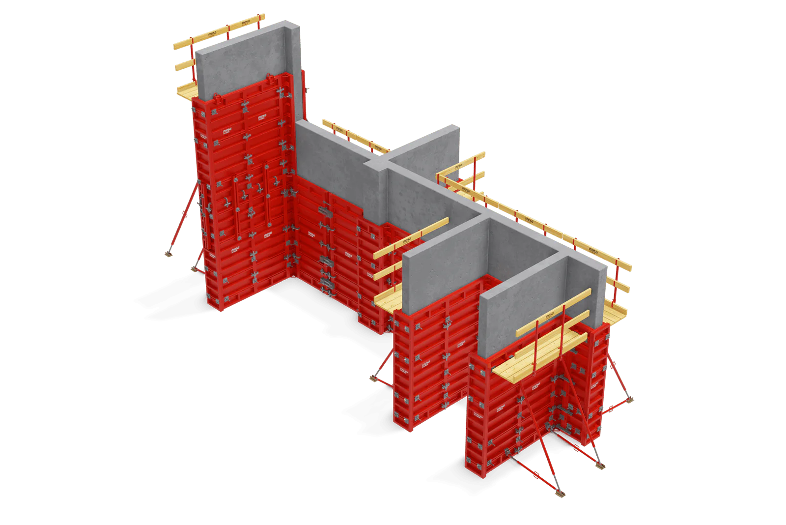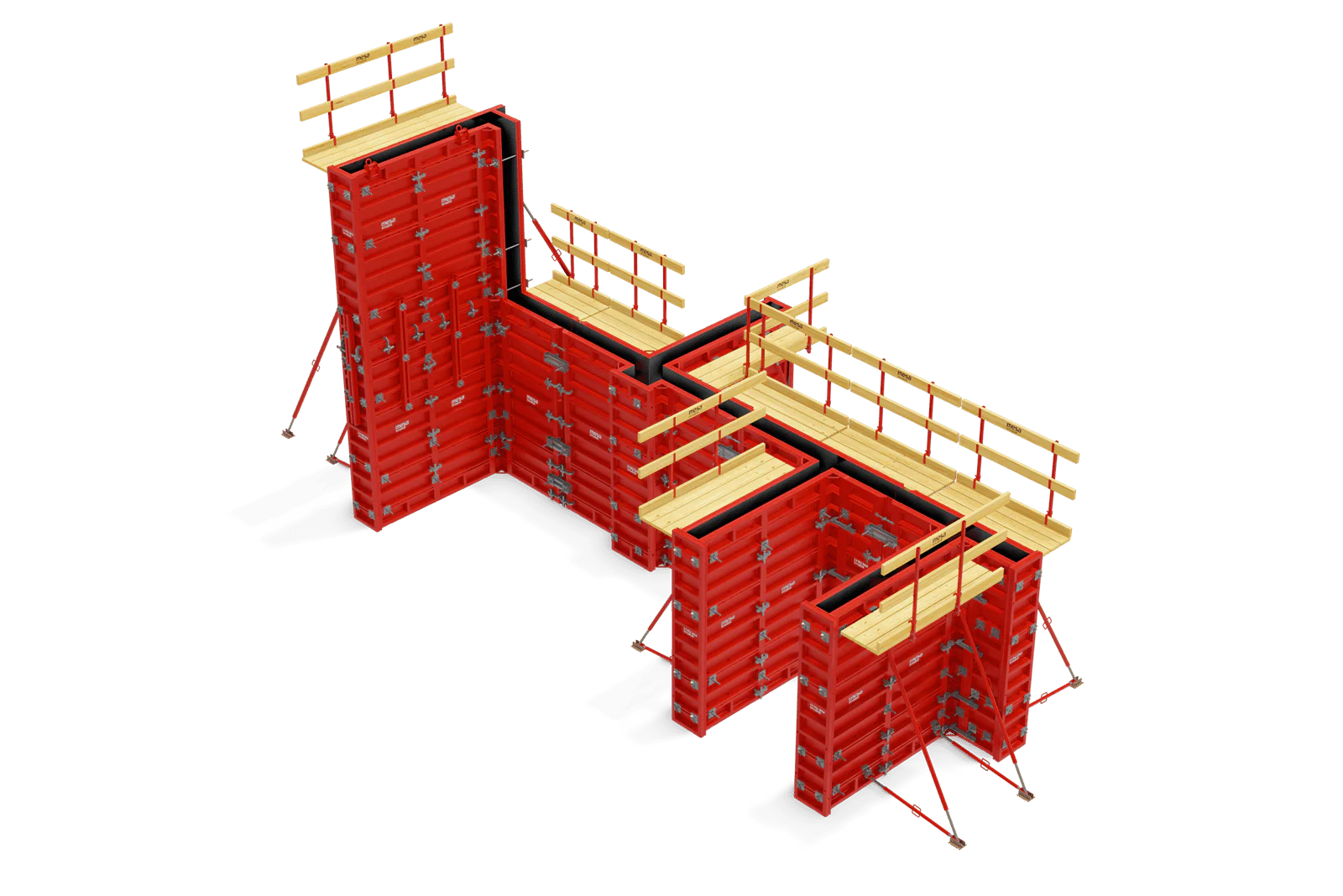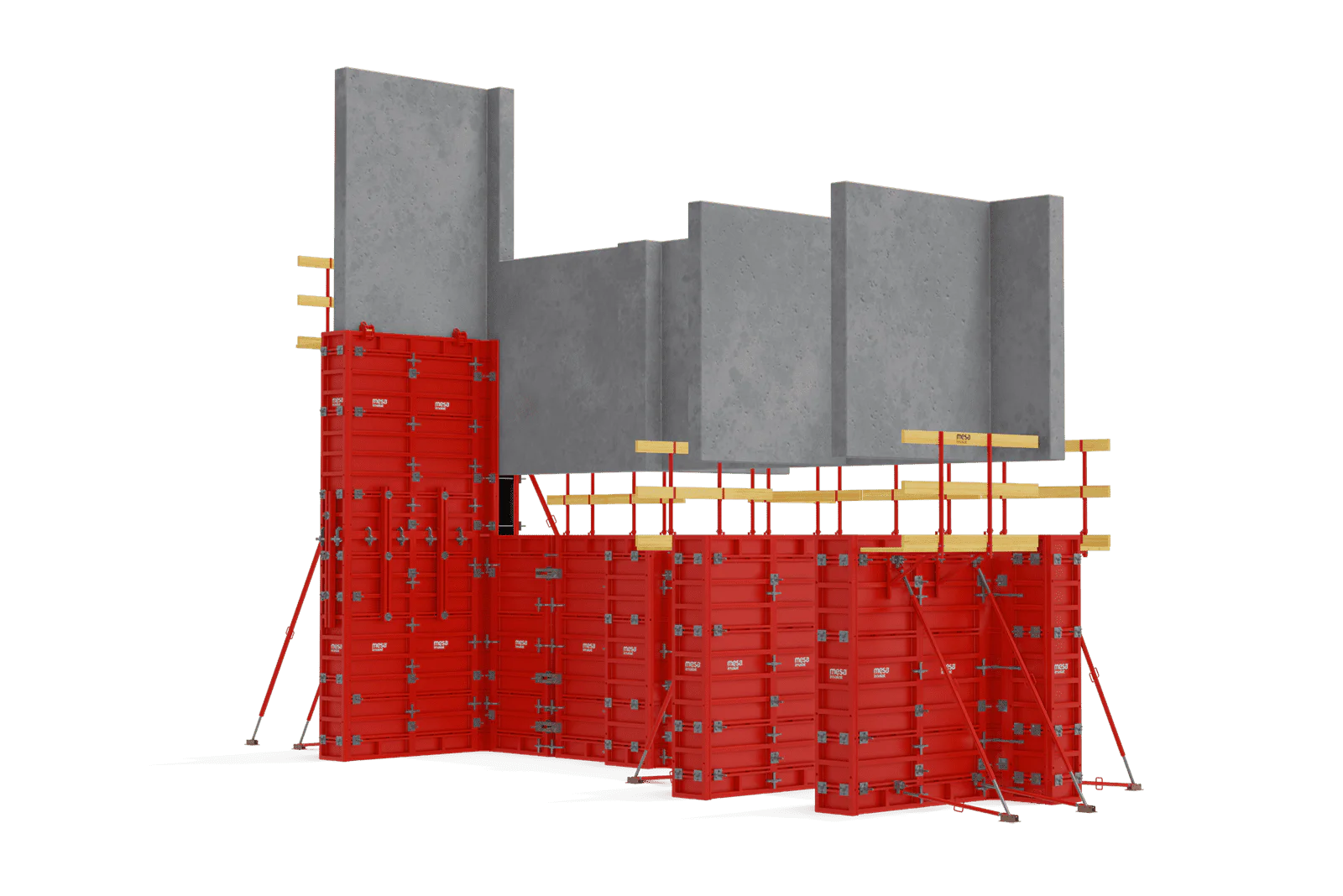 Стеновая опалубка REVOLA — это система, используемая вместе с подъемным краном, при этом максимальное давление бетона на опалубку составляет 100 kN/m2. Благодаря высокой прочности при сжатии происходит сокращение времени непрерывного бетонирования.