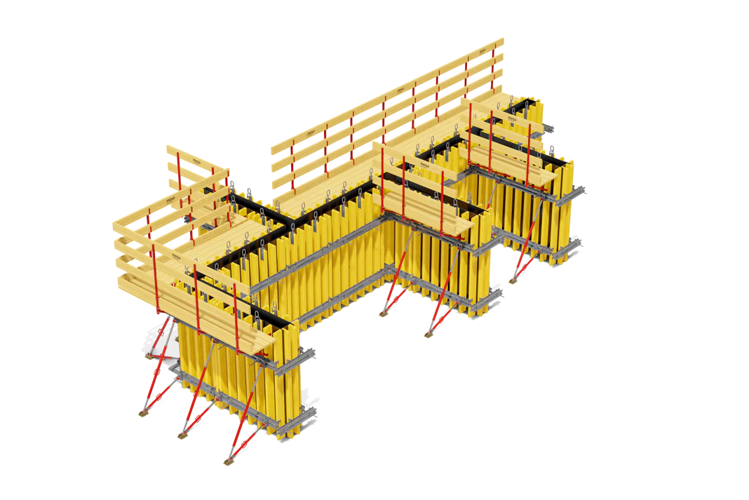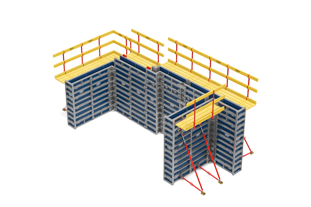 İş Güvenliği: Tünel Kalıp Sistemi’nin ayrılmaz bir parçası olan ve tüm kat çevresine ve boşluklara yerleştirilen iskeleler, yüksek iş güvenliği sağlar.